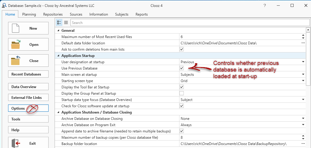 3. Configuring the program Options to always open the last file opened when starting Clooz.