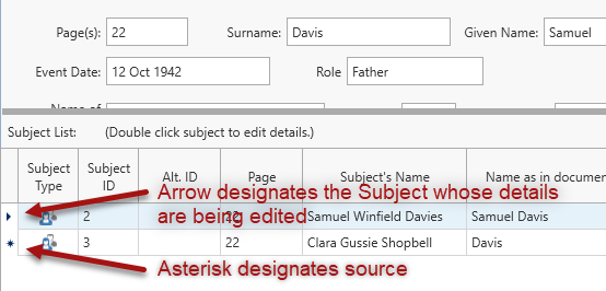 When a Subject record is selected for both editing and as the source for further copying, only the asterisk is visible.