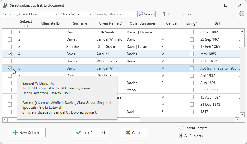 To link one Subject, double-click that row in the Subject Selection dialog. To link a set of Subjects, click the check boxes on the left side of the Subjects you want to include. Then click the Link Selected Subjects button to link all of those selected to the Information Record.