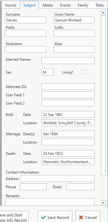 The data entered into Information Records reflects what was shown in the document you found, and you could link Subjects to this record. However, what if you want to edit the Subject record itself, such as adjusting the spelling of the name of a person that will appear in the main list of Subjects. Obviously, this can be done in the Subject editor, but you can also do this without exiting the Information Record editor by going to the right-side panel and clicking on the Subject tab. The Subject panel contains all the editable data fields making up a Subject record.