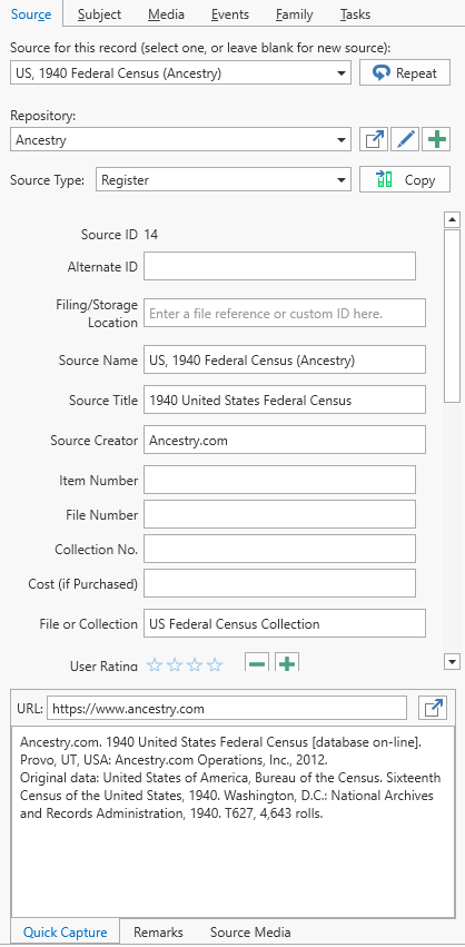 - Use the Quick Capture area to deposit source citation information. For example, if you are gathering data from a web site that displays a block of source citation data, copy and paste the contents of that block into this field. A field is also provided to paste the URL address of web sites for easy retrieval (not recommended for long term reference since web sites frequently change). The priority here is to capture the information needed for an accurate citation. Getting it into the desired format can happen later.