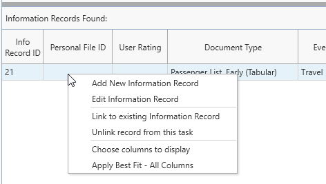 Information Records in Clooz hold the content information coming from a document or other source. These differ from a Source record that contains most of the citation information describing the docment, or the Repository record referring to the facility or online service where the document was found. generated by the search can be linked to these tasks as search results.