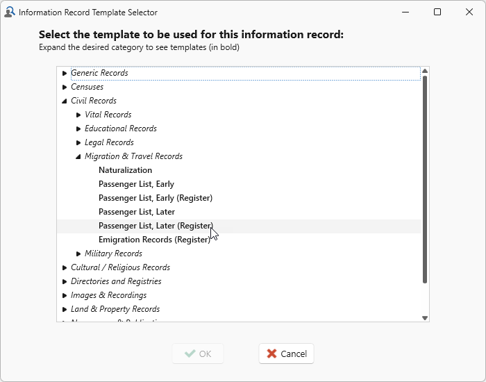 A list of Information Record templates will appear for you to select which is to be used with the record you are creating. -