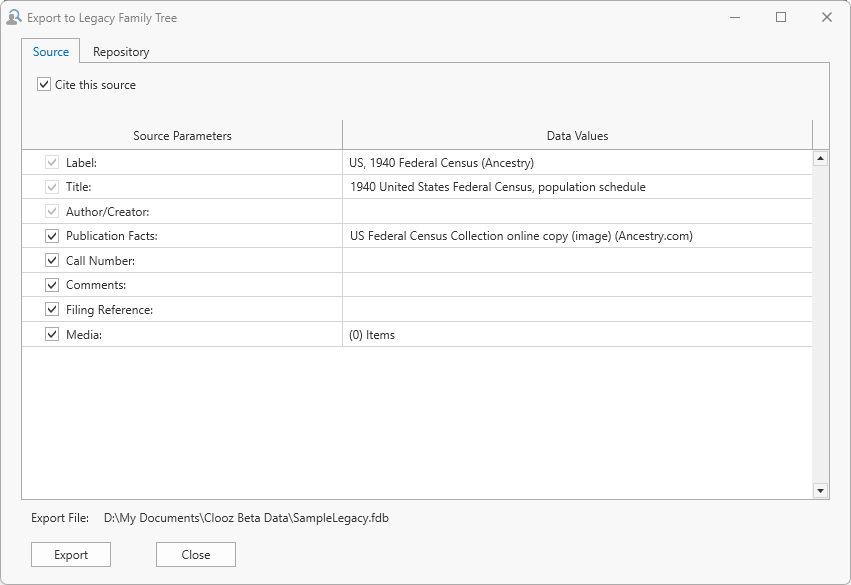 A source record in Clooz should be viewed as the higher level components of a source citation. Citation details are pulled from the citing Information Record. record being exported by the Record Exporter appears on the Source tab within the exporter window. You have complete control over what information will be exported using the controls provided. The associated Repository