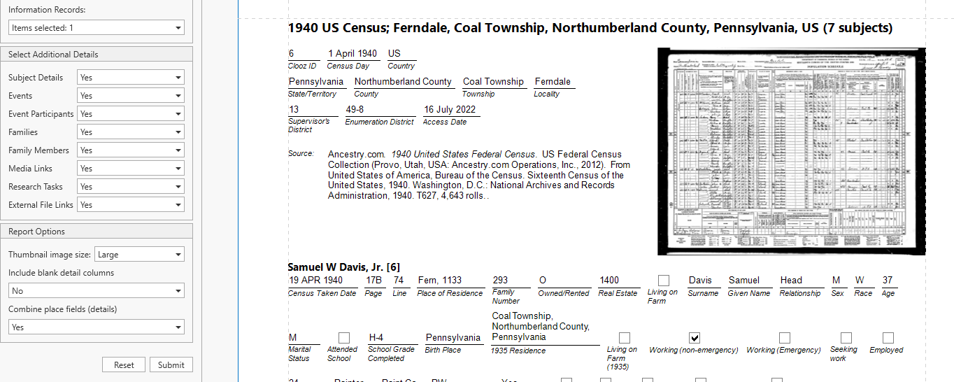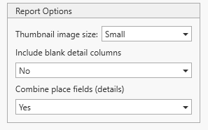 Subject-detail fields which are parts of a location sequence (country, state, county, etc) can be combined into a single location field rather than having individual fields for each of the parts (as would appear in the Information Record editor templates). The resulting field then uses less space in the report. The initial default setting is "Yes."