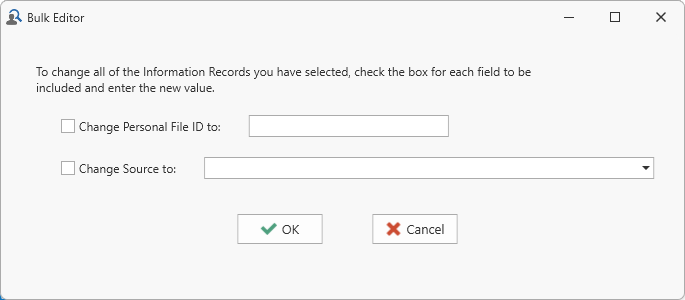 Bulk edits is a special feature for making the same change to multiple records (those currently selected) in a single operation. It only applies the SourceClosed A Source record in Clooz should be viewed as the higher-level component of one or more source citations. Source citation details are usually included in the citing Information Record., Information, and SubjectClosed Subjects are the objects you are gathering information about such as people, buildings, ships, etc. In most cases within Clooz, the Subject will be a person. However, Clooz supports several other Subject types such as businesses, real estate/buildings, ships and artifacts. pages.