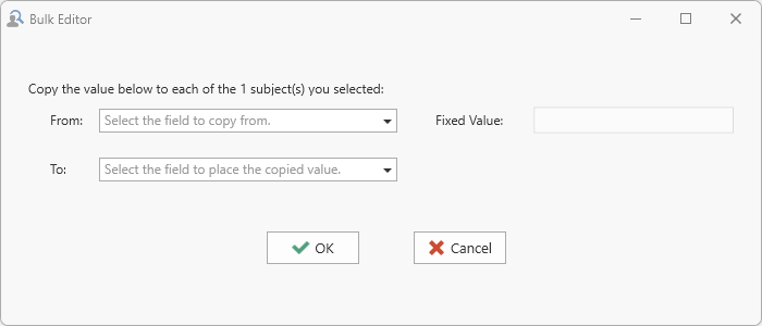 First select all the records to be affected from the main screen, and then right-click to view the Context MenuClosed The menu window that often appears when you right-click an area on the screen.. Select Bulk-Edit Items to display the Bulk Edit dialog to the particular data type you are working with.