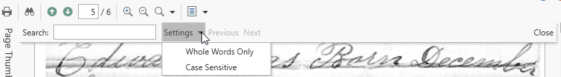 If the currently loaded PDF file is based on text characters (as opposed to an image of text), you can search for text values using the Find text button (or select the same in the context menu).