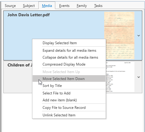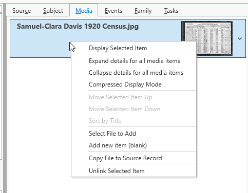The context menu in the media panel provides a number of functions that are useful when you have a larger number of media items linked to a record. You can expand or collapse the details for all of the media items in one click, or use the compress mode to display smaller thumbnail images, allowing more media items to be visible within the media panel.