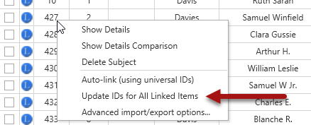 To perform this update, open the Data Transfer Manager for the desired external file and right click anywhere on the Clooz record list to display the context menu. Then select the Update IDs menu item.