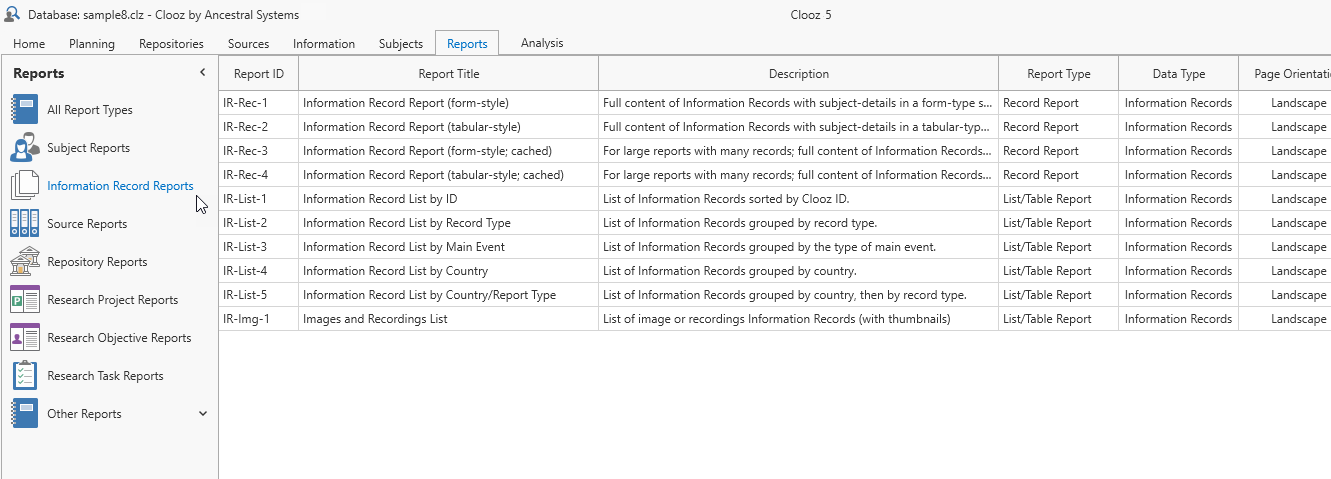The design of the report layouts in Clooz has been done to make the reports most useable for the typical user. An assumption has been made that you probably only have a regular size printer supporting Letter/Legal/A4 paper sizes. Some Information Records