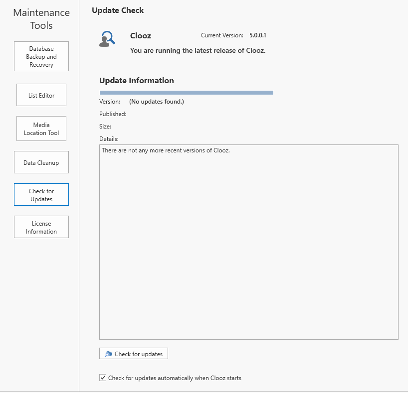 It is highly recommended you allow Clooz to check for updates automatically each time the program starts. Check the box at the bottom of this screen or in program options (both control the same setting).