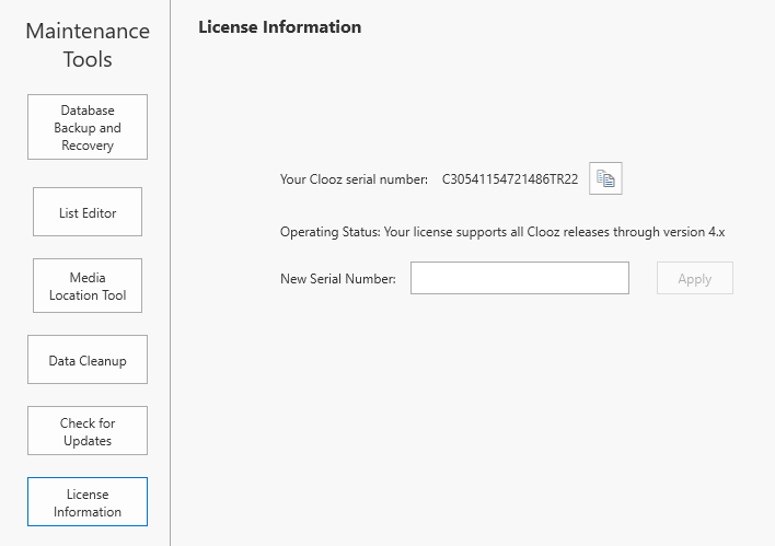 Use the License Information tool to obtain your current Clooz serial number and status.